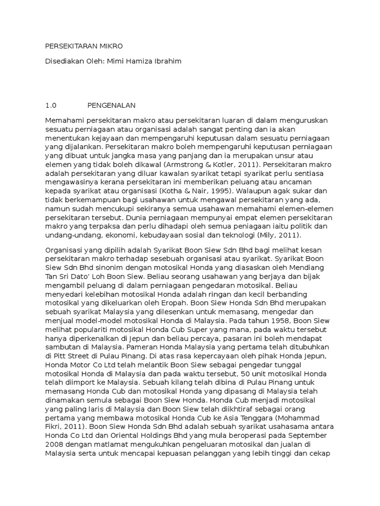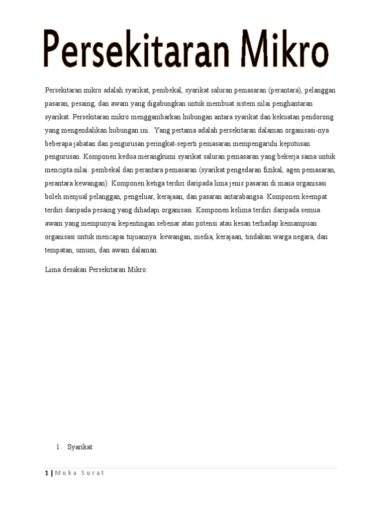 Persekitaran Mikro - Kumpulan yang dapat memberi kesan kepada keupayaan organisasi untuk mencapai.. Documents similar to persekitaran mikro. Berikut adalah pandangan micro dan macro pada pembangunan perniagaan: Abstrak faktor persekitaran merupakan aspek yang penting di dalam membantu seseorang usahawan di dalam meneroka dan mencari maklumat untuk menceburi bidang keusahawanan. Persekitaran mikro adalah pautan kecil dari keadaan sosial, yang mempengaruhi perkembangan utama individu. Persekitaran yang mempengaruhi aktiviti perniagaan secara langsung.